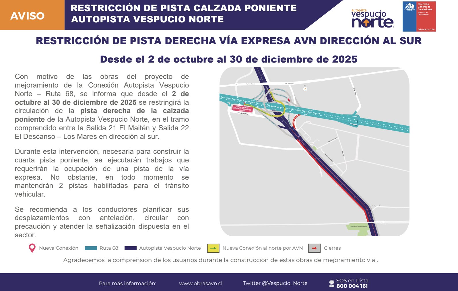 Reducen capacidad vial de tramo de Vespucio por construcción de una cuarta pista...
